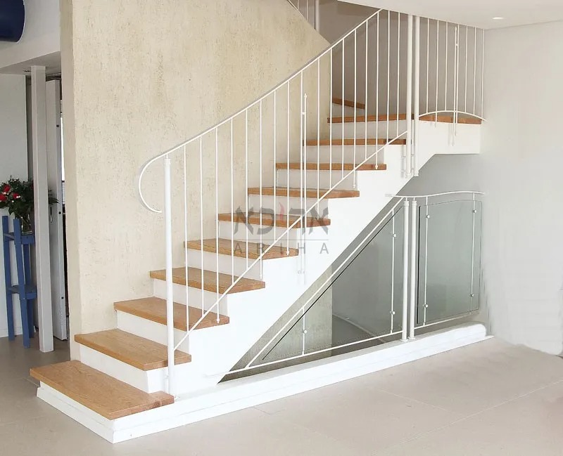 גימור המתכת הוא בצבע לבן כך שיתאים את עצמו למראה הלבן והנקי של גרם המדרגות, בגרם המדרגות השתמשנו בשלח מעץ ורום והחיבור בין המדרגות נשאר בטיח לבן ומשתלב עם המעקה ליצירה מראה כללי נקי.